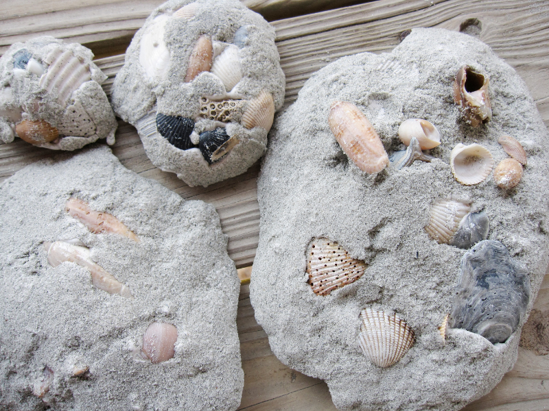 You can cast plaster shapes using sand from the sandbox (or the beach!). Simply dig a hole in the sand, line it with shells, rocks, and other found treasures, and then fill the hole with plaster.