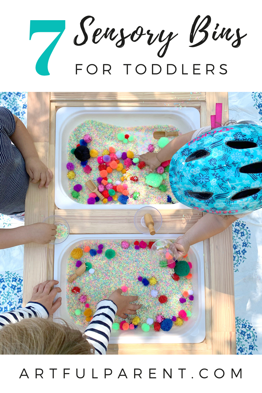 Sensory bins for 2-year-olds encourage exploration of materials and promotes creative, imaginative play time for kids.