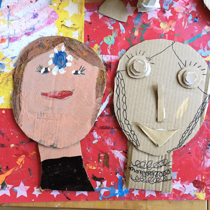 Explore texture with mixed media collage portraits for kids! Use cardboard as a base and create features with recycled collage materials. Project and post by