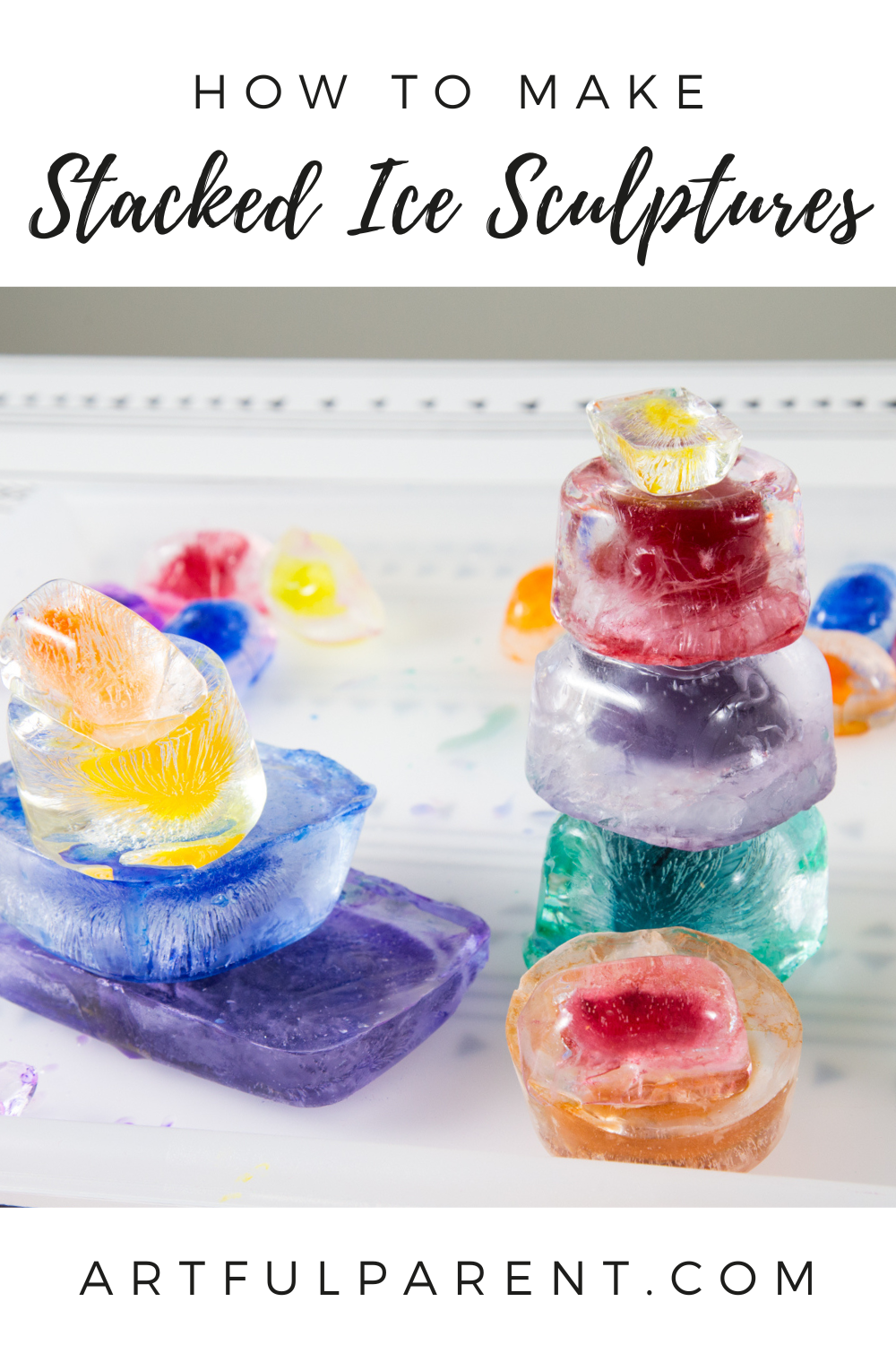Colored ice sculptures are a fun and easy 3D art project for kids! Kids can stack the ice shapes and refreeze for a beautiful ice sculpture.