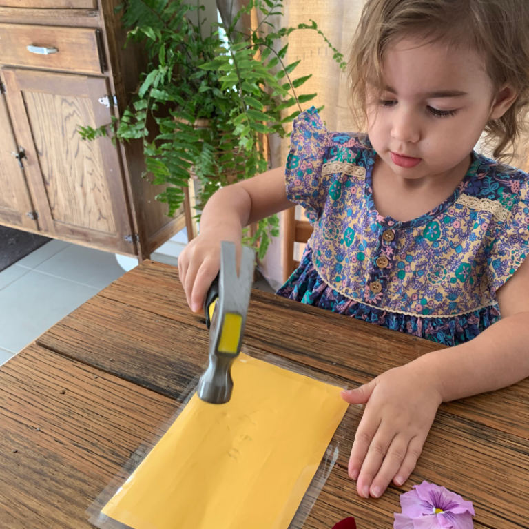 That’s why flower pounding is a favorite. It’s fun, hands-on, and the results are immediate. They love hammering the flowers and peeling them back to reveal the prints.