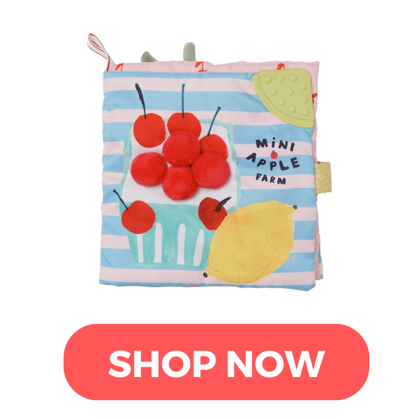 This sweet little farm book is the perfect toy to stick in your bag as you leave the house. Full of crinkle sounds, interesting textures, and a rubber teething corner.