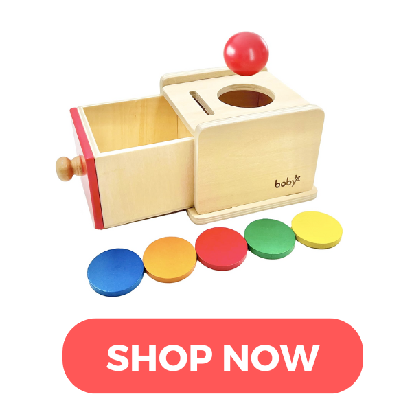 A toy designed with Montessori principles in mind that helps babies exercise their motor skills and explore object permanence.