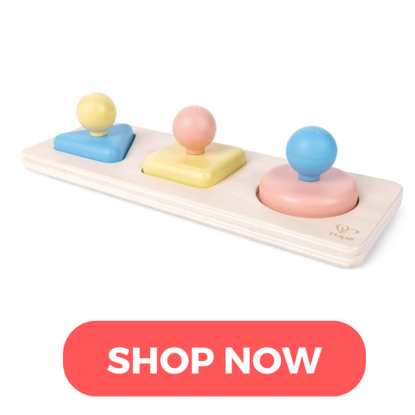 Your baby will love the challenge of pushing these textured shapes through the elastic bands. I especially love how each component of this toy could be used in different ways as your baby grows!