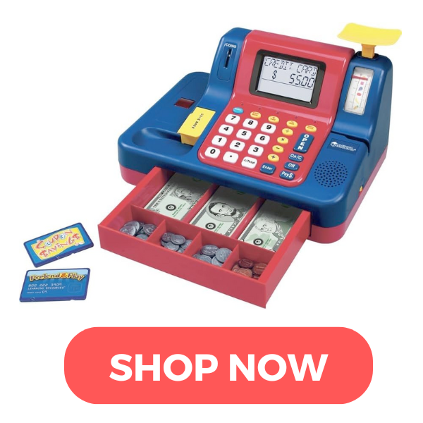 Just like all great open-ended toys, a cash register can be a central player in all kinds of imaginative play: grocery store, restaurant, office work, farmer’s market, pet store… your preschoolers will come up with so many fun ideas!