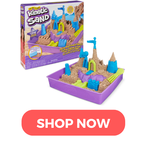 Sensory bins are so great for open-ended play time! Kinetic sand is one of our favorite sensory materials, and we love this fun beach set (also perfect for construction vehicles to drive through!)