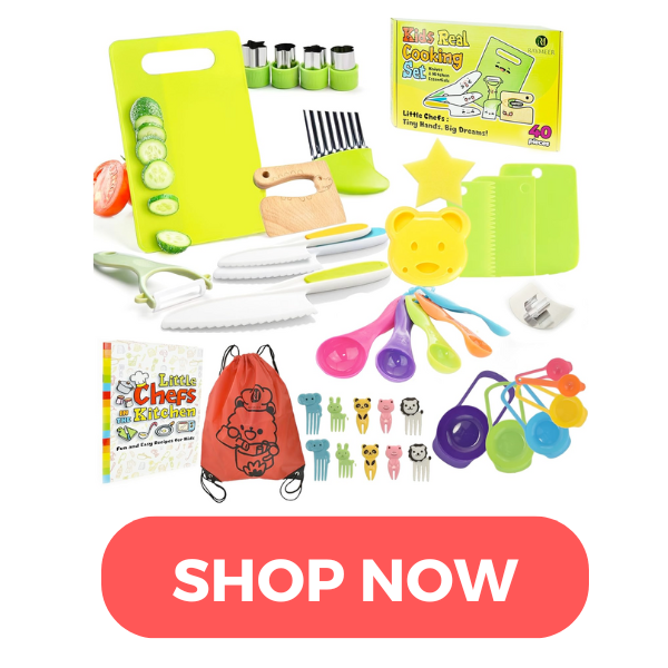 A set of knives that actually cuts, but isn’t sharp enough to be dangerous, will give your child a great sense of independence in the kitchen. You can also purchase kid-safe knives alone.