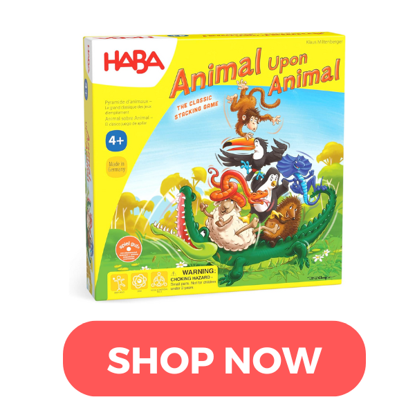 This game comes with a set of wooden animals that you precariously stack one upon the other. We love it for all ages!