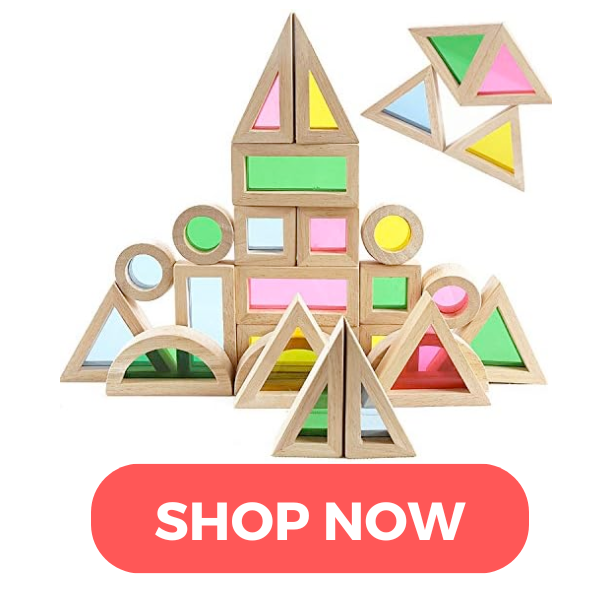 We love these rainbow blocks as a fun addition to any basic building set. They’re especially fun to play with beside a sunny window!