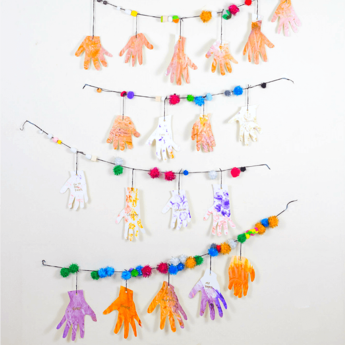 Pair finger-painted hand tracings with festive pom-poms to create a Thanksgiving garland for kids. You can write or draw what you are thankful for on the hands as a special family activity.