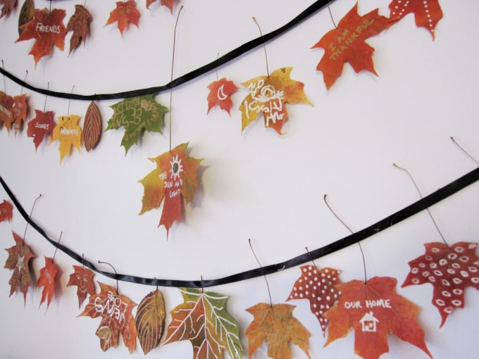 Decorate dried leaves with Sharpie markers, and then simply attach the stems to a ribbon with hot glue and hang your garland up! You can also try this with glitter leaves!