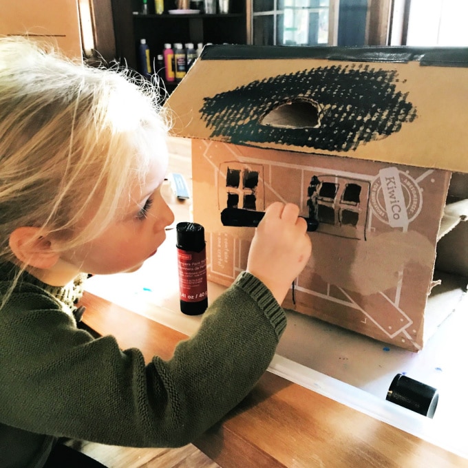 Pro tip: Box cutters make cutting cardboard SO MUCH EASIER. I highly recommend it. Just be extra careful to keep it away from little ones! You can also give older kids more independence with a cardboard construction kit like this one. - Cut out windows and doors