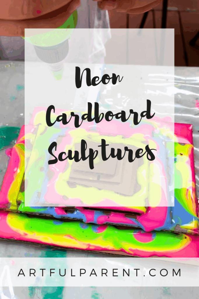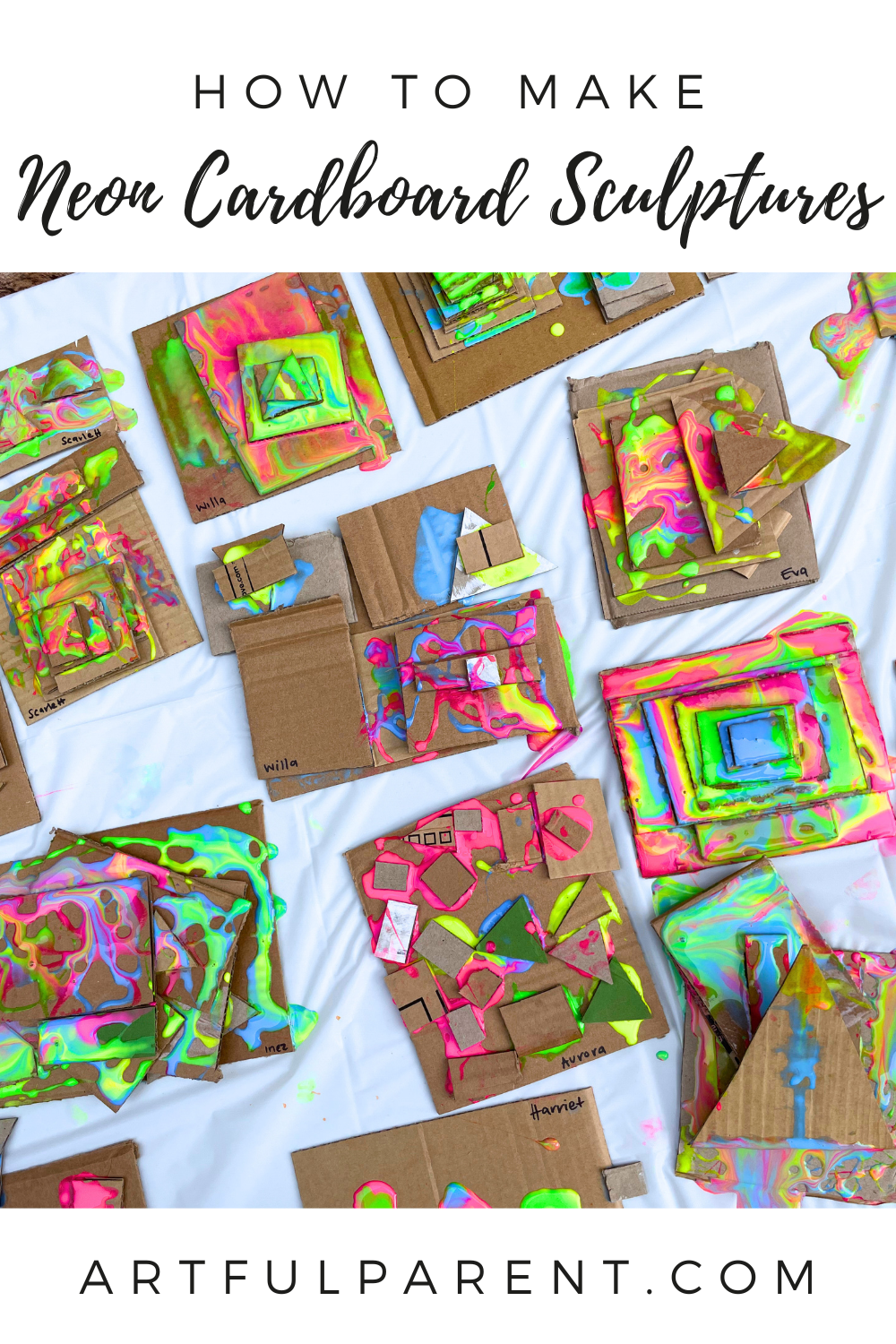 Create vibrant neon cardboard sculptures with kids! A fun process art activity using recycled materials. Perfect for kids of all ages. Project and photos by Caitlin Mansfield from Messy Art.