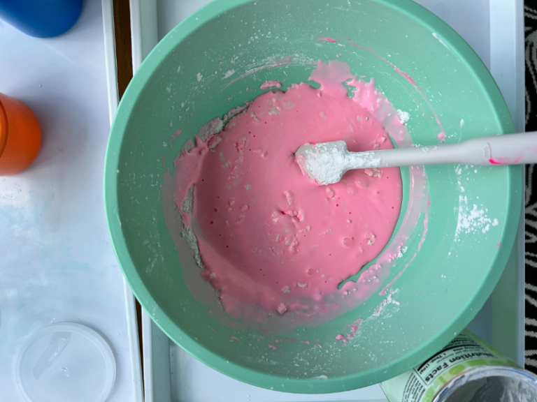 This sensory play material is super messy, so we recommend pouring it in a bin and taking it outside! If your kids do play with this inside, try putting it into a sensory table or bin with a floor covering underneath it. Or take it to the bathtub for extra easy clean up!