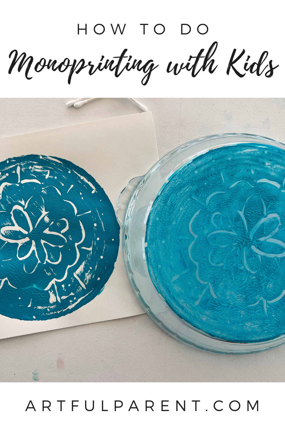 Learn the easiest way to do monoprinting with kids. Simply spread paint on the bottom of a pie plate and draw a design with a Q-tip.