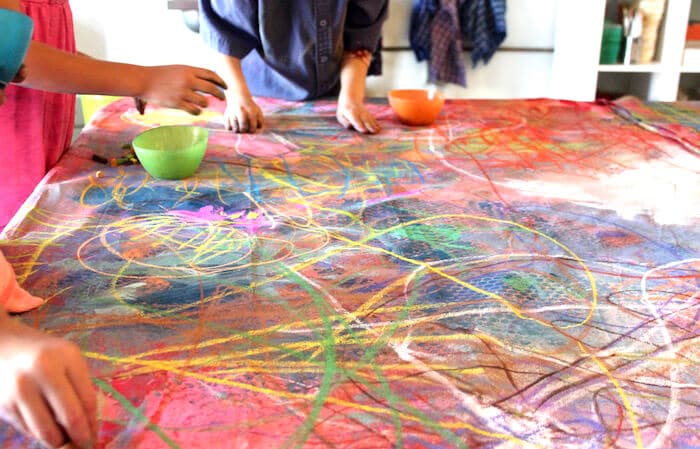 For the final step, put chalk pastels into bowls, lay them onto the painting and let the kids draw. You can give a little demonstration on creating patterns, making small marks or big sweeping arm movements, and encourage the kids to explore them all.
