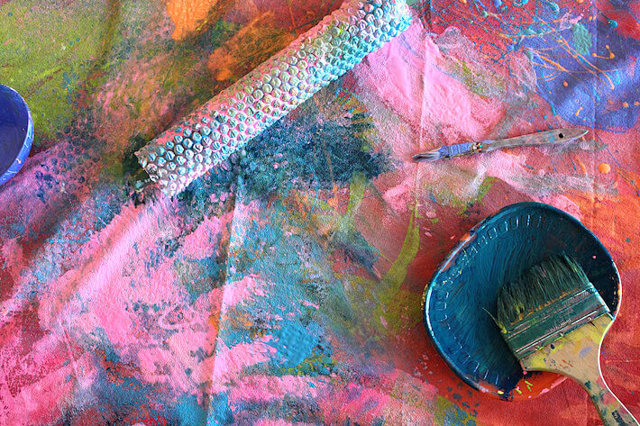 Then, put the paint onto plastic plates and offer large brushes, foam brushes and a rolling pin or paint roller wrapped with bubble wrap. The kids can paint the bubble wrap and roll the pattern onto the painting.