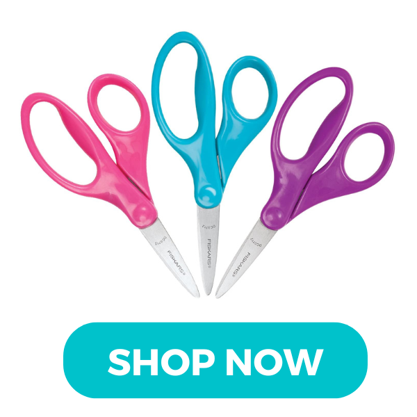 Around age 2-3, kids can begin practicing making small snips with scissors on paper (with supervision, of course). These blunt tipped scissors are perfect for the task. Once your child enters elementary school, these pointed tip scissors are a better fit.