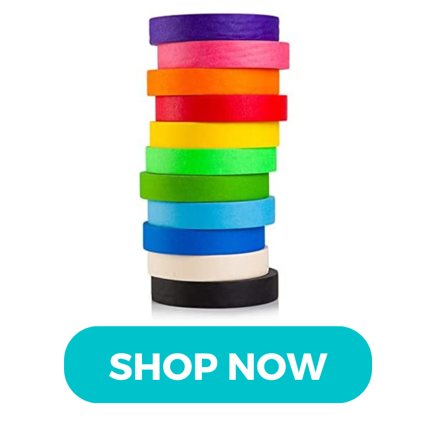 We’re tape happy! Besides colored masking tape, we use lots and lots of regular Scotch tape, and we have a bit of a love affair with washi tape and other printed craft tapes.
