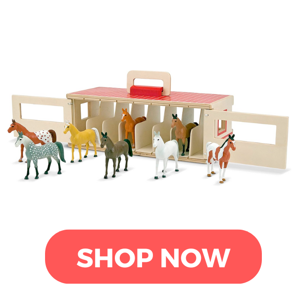 Toddlers love taking objects “in” and “out,” so this stable with horses is a great choice! We also love this unicorn stable for a magical twist.