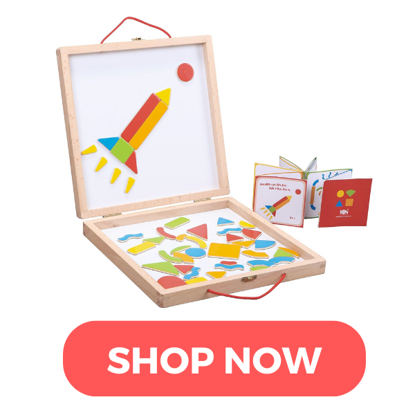 Perfect for quiet times, this magnetic picture set comes with a convenient carrying case that fits all the pieces right inside. I love that this can grow with your child, adding the extra element of the puzzle book as they gain skills!