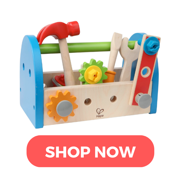 Toddlers love to tinker, and we love a sturdy wooden set like this one that comes with enough pieces to keep them happily poking, twisting, and hammering!