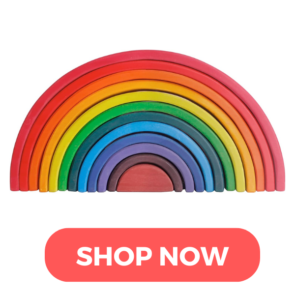 We love these rainbow blocks as a fun addition to any basic building set. They’re especially fun to play with beside a sunny window!