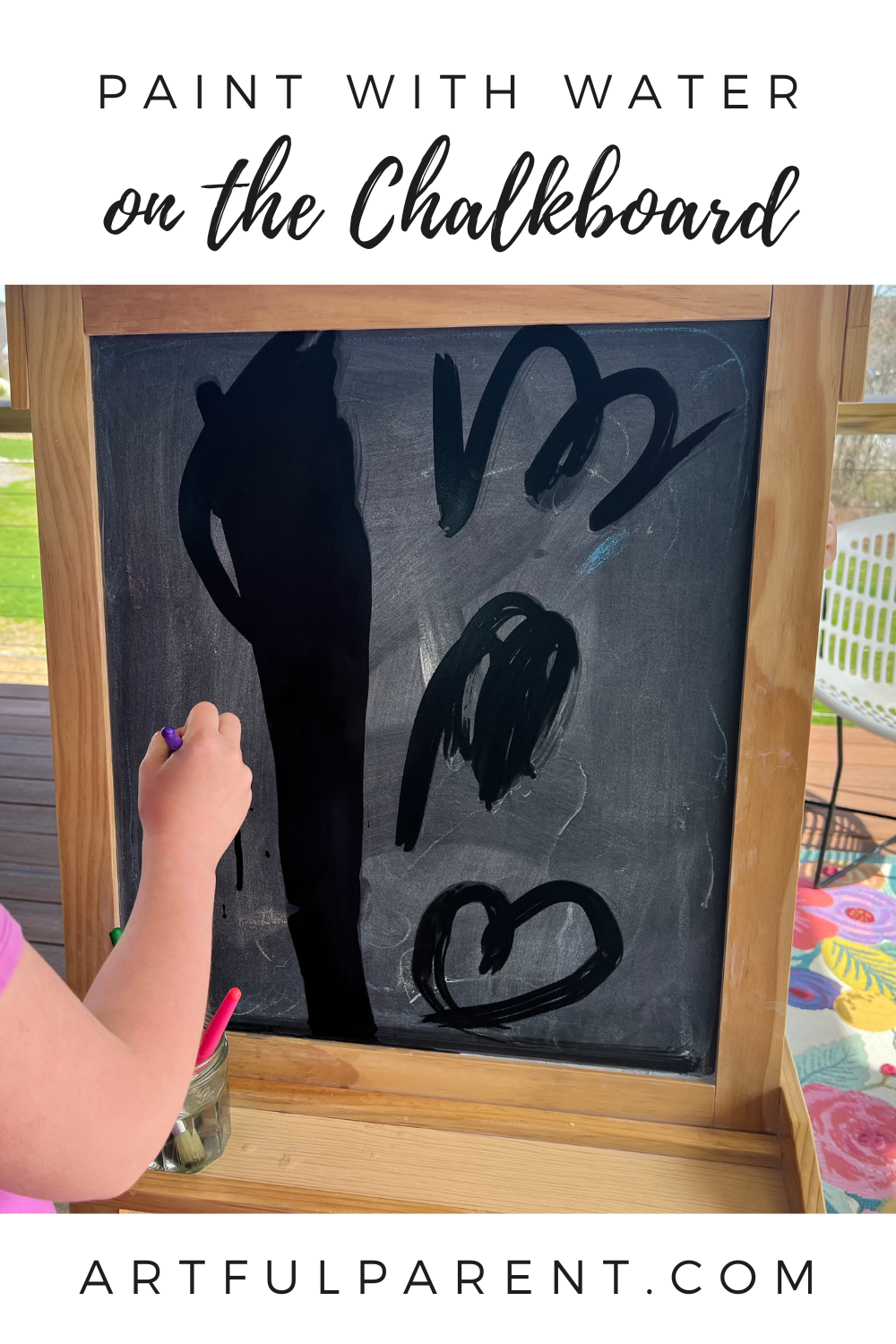Place your chalkboard in a spot where your child can comfortably reach and move around. We love to do this activity outside, so you don’t have to worry about where the water goes!