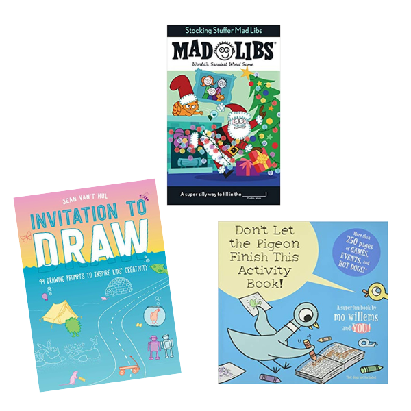 We love to add an activity book, doodle book, sticker book, Mad Libs, or activity pack, rolled up and tied with a ribbon.