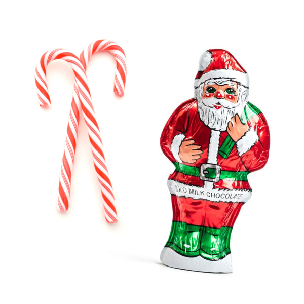 A few assorted Christmas candy and snack items such as a large candy cane, foil-wrapped Christmas chocolates, Pez, a hot cocoa packet, snack-sized goldfish, gum, or your child’s favorite treat.