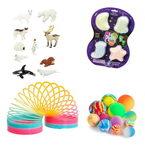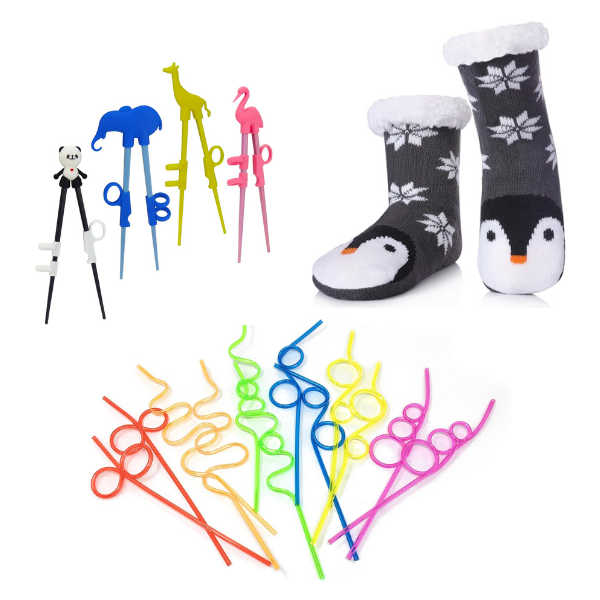And last but not least, a few small and useful objects such as a fun toothbrush, fuzzy socks, a bath bomb, training chopsticks, erasers and pencils, a brush and hair accessories, and silly straws.