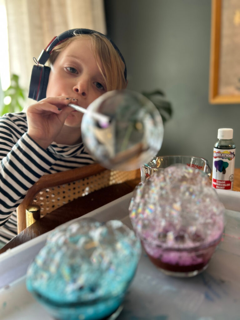 Try making your own homemade bubbles and practice mindful breathing with your kids. You can even create your own bubble wands!